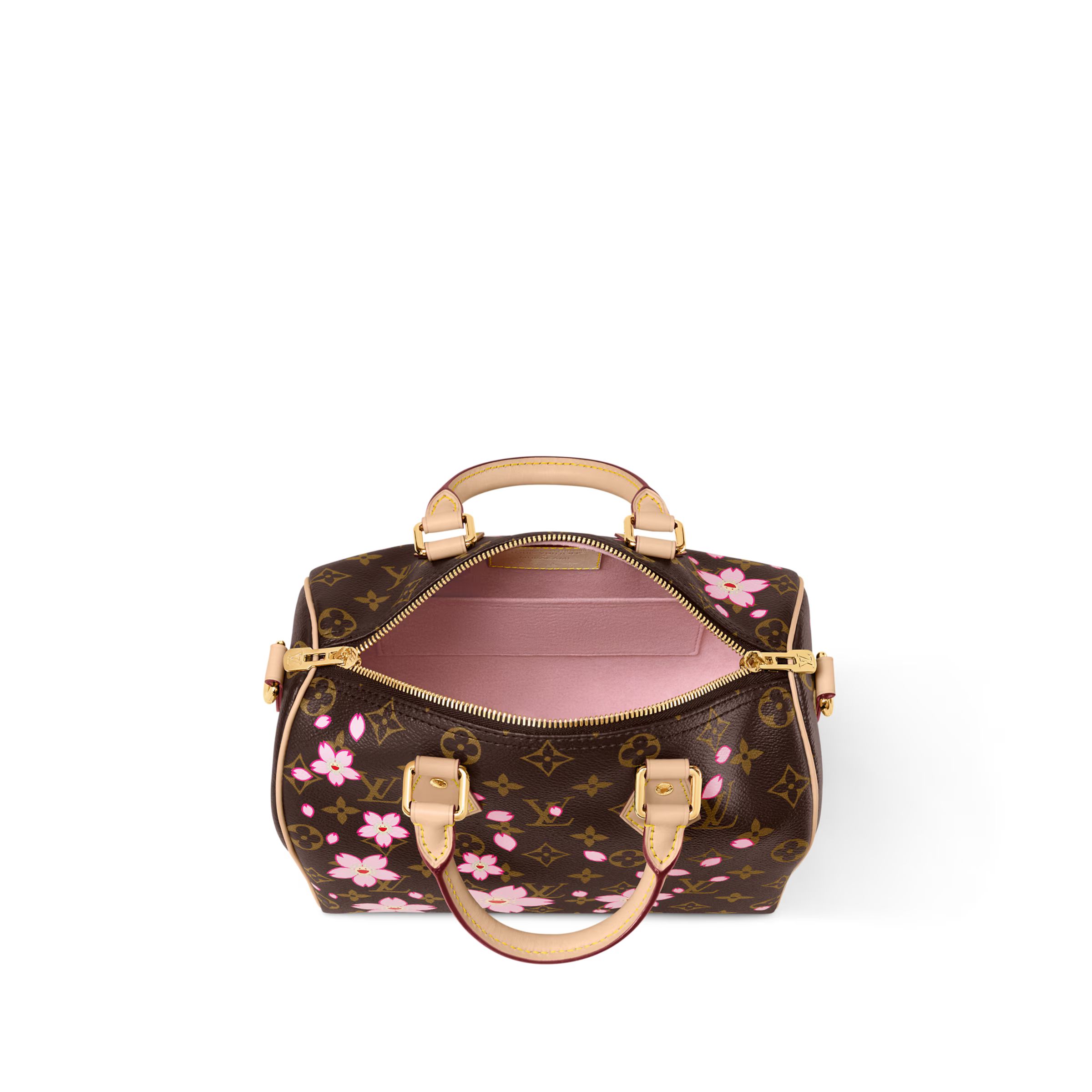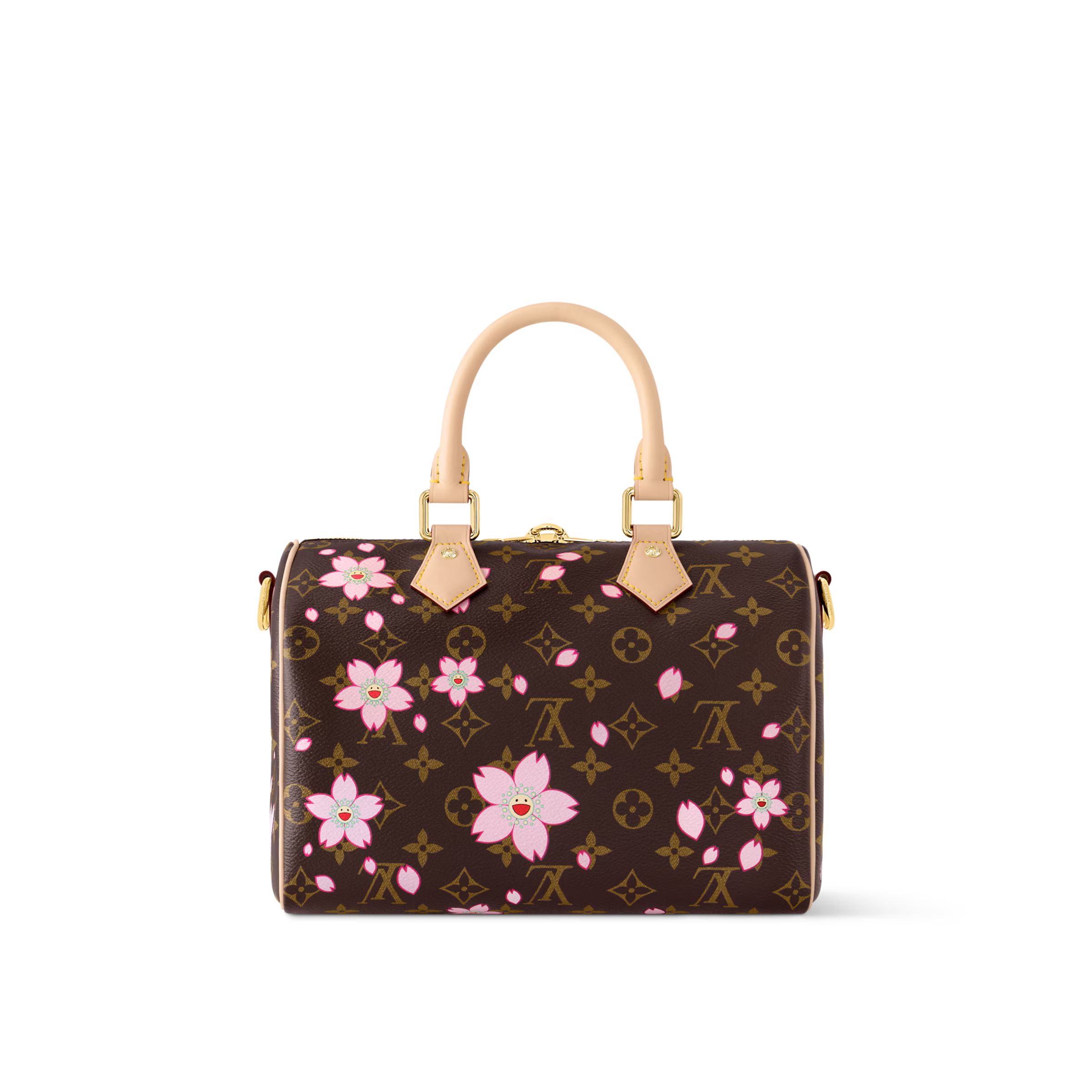 「ルイ・ヴィトン × 村上隆」コレクションのエクスクルーシブなリエディションの一部である「LV × TM スピーディ・バンドリエール 25」。取外し可能なチェリーブロッサムのバッグチャームをはじめ、この著名なアーティストならではのプレイフルなスタイルで表現された華やかなチェリーブロッサム・モチーフで、メゾンのアイコニックなモノグラム・キャンバスにひねりを加えました。ヌメ革が際立つ、エレガントなトロンハンドルと着脱できるレザーストラップの他、ゴールドカラーのパドロック(錠前)付きダブルファスナーが中身をしっかり保護します。