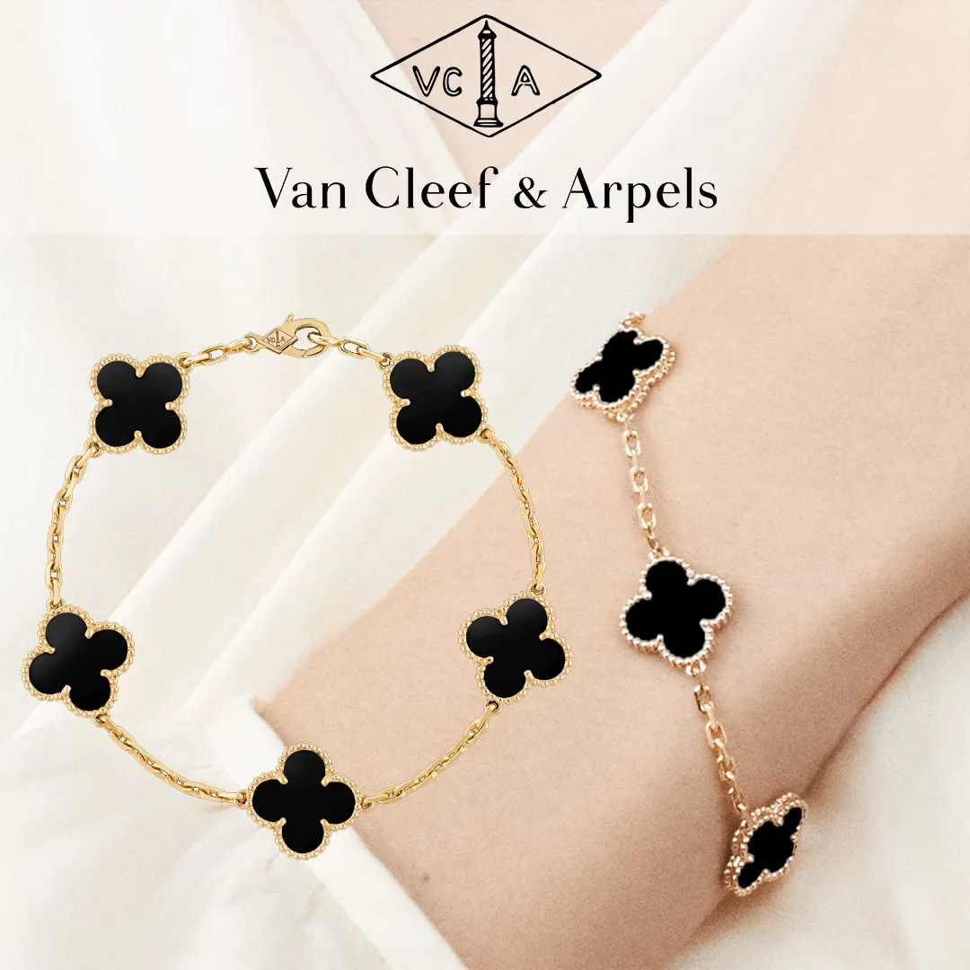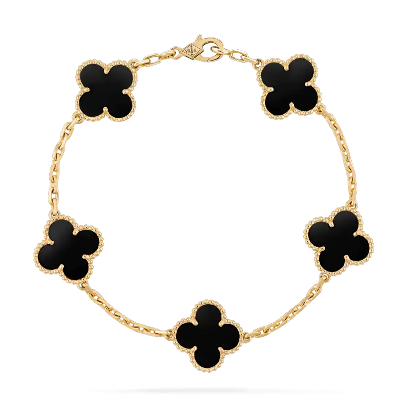ヴィンテージアルハンブラブレスレット、5モチーフ、イエローゴールド、オニキス。