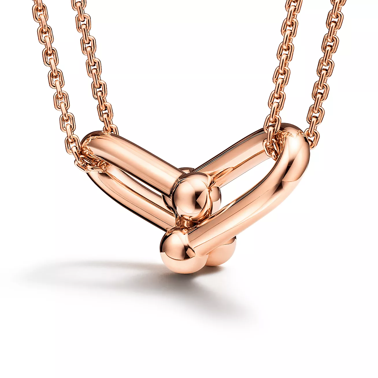 エレガントに立ち向かうニューヨークの女性の精神を捉えたティファニー ハードウェア。斬新なゲージ リンクと繊細なチェーンが印象的なモダンなリンク ペンダント。