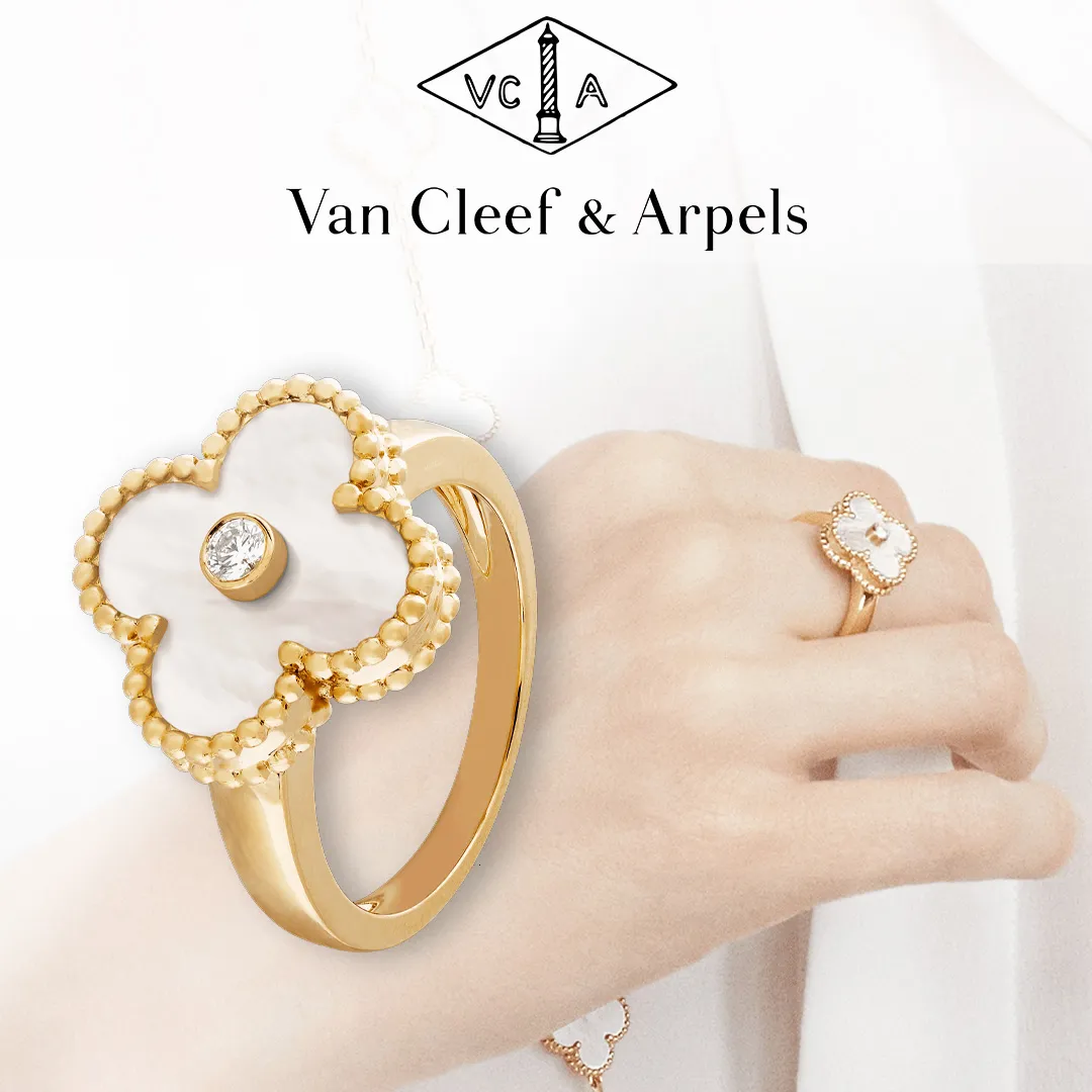 ヴィンテージアルハンブラリング、イエローゴールド、ホワイトマザーオブパール、ラウンドダイヤモンド、ダイヤモンド品質DEF、IFからVVS。