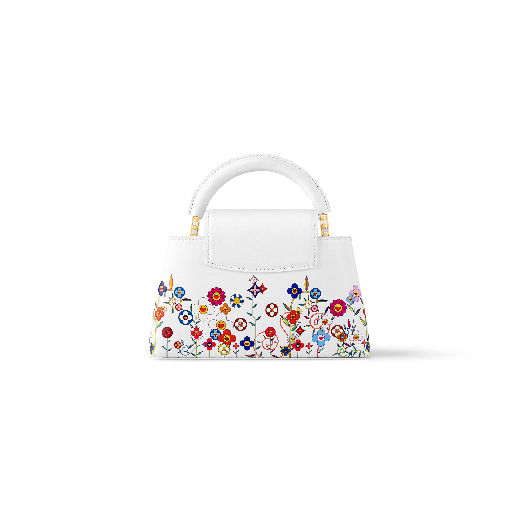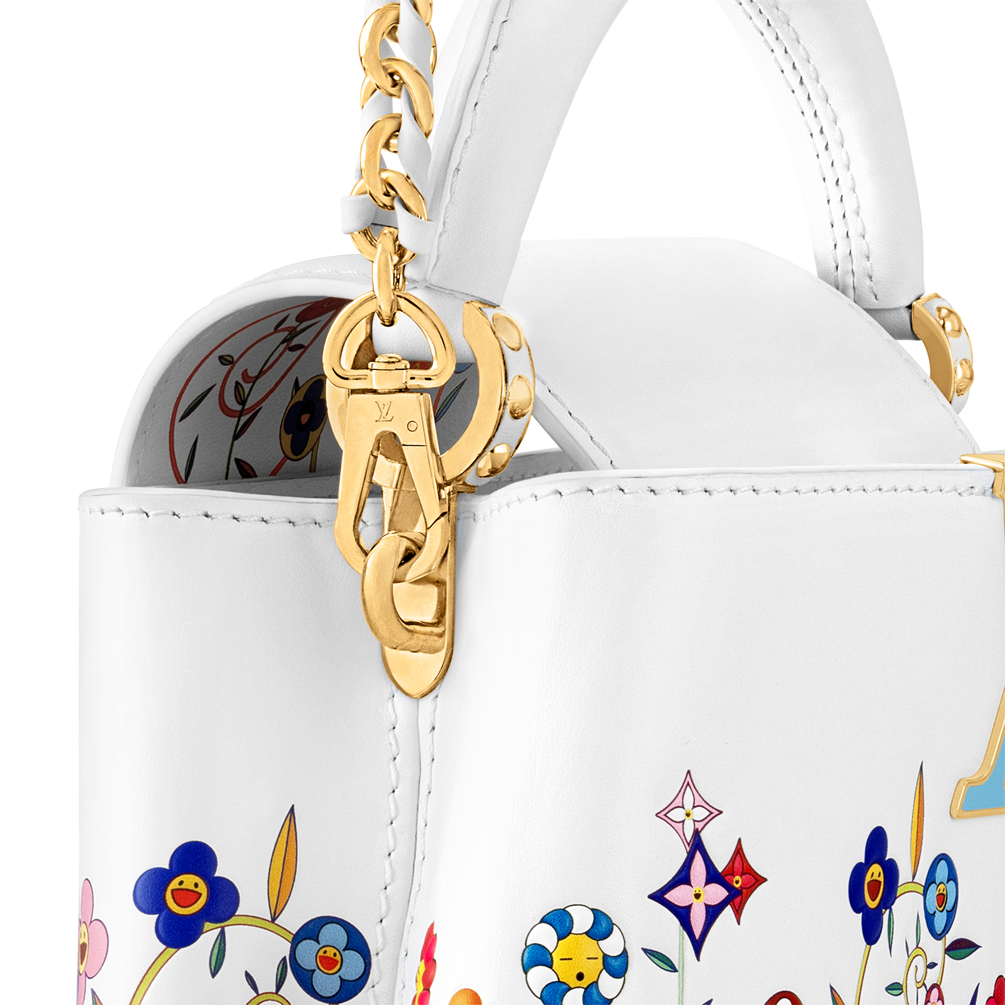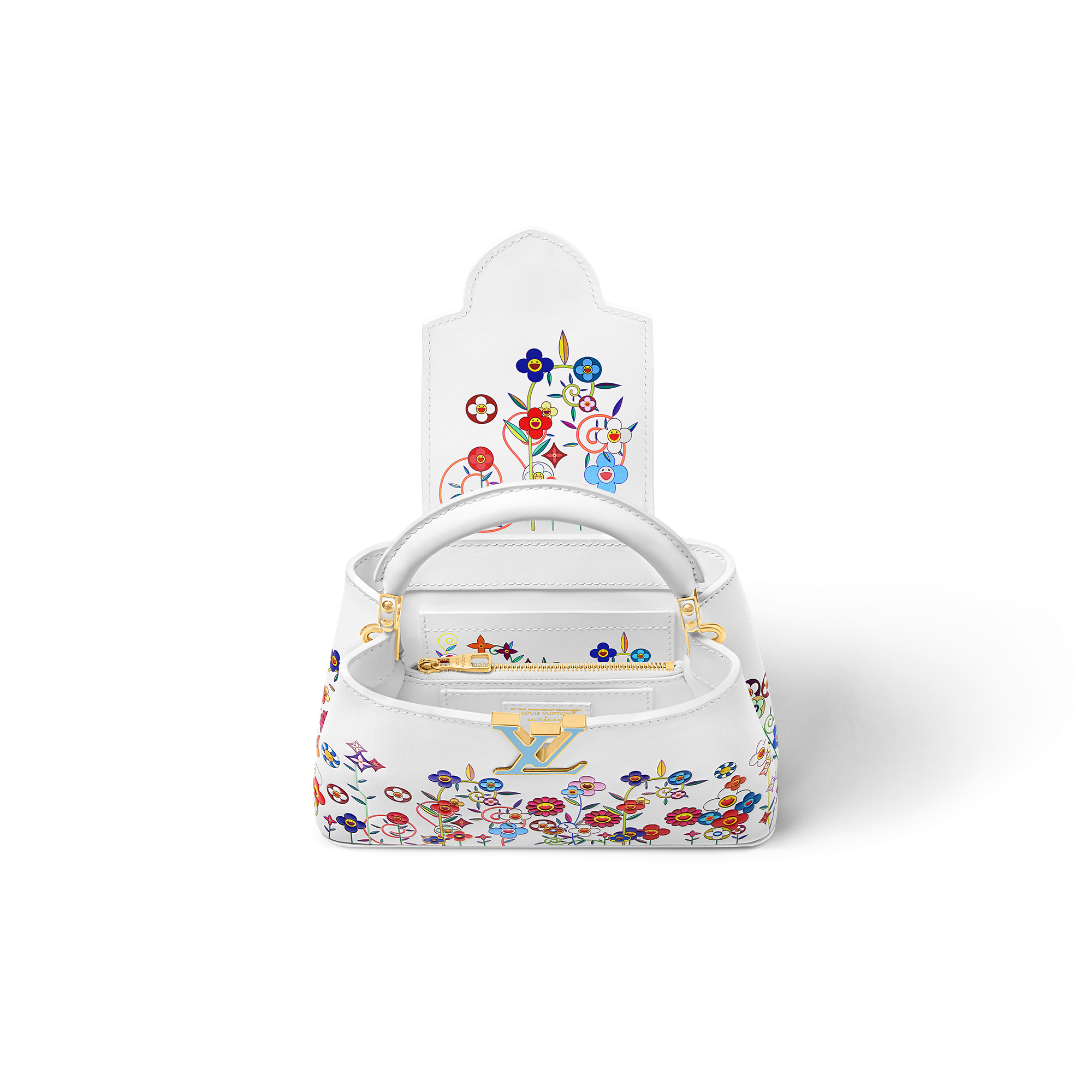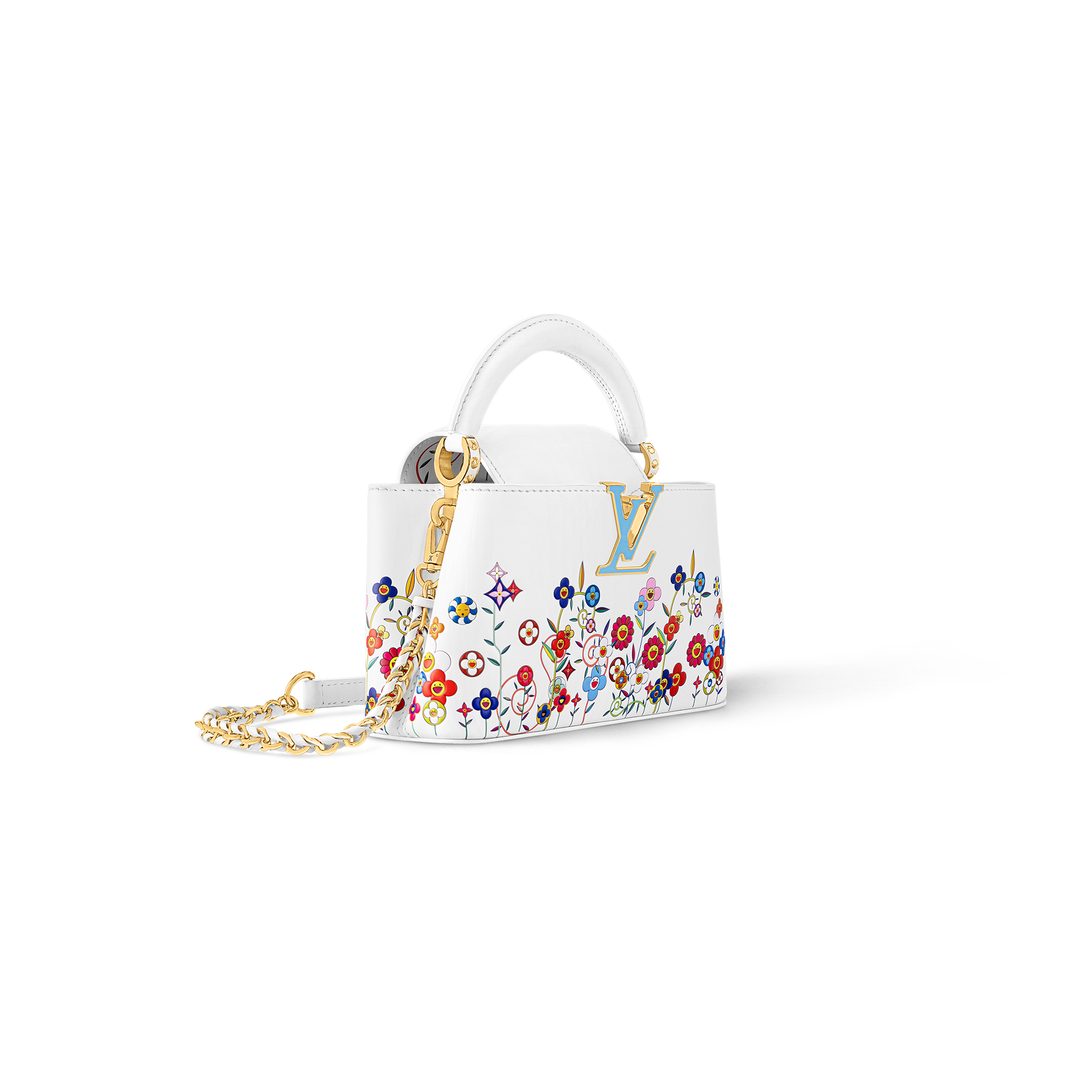 「ルイ・ヴィトン × 村上隆」コレクションのリエディションの一部としてプレイフルに再解釈された、エレガントなステートメントアイテム「LV × TM カプシーヌ EW MINI」。メゾンを象徴するモノグラム・フラワーをこの日本人アーティストならではの「スーパーフラット」のスタイルでいきいきと再解釈し、レザーにプリントとエンボス加工で施しました。フレッシュブルーをポップにあしらった、アイコニックなLV イニシャルと取外し可能な編み上げストラップも魅力。