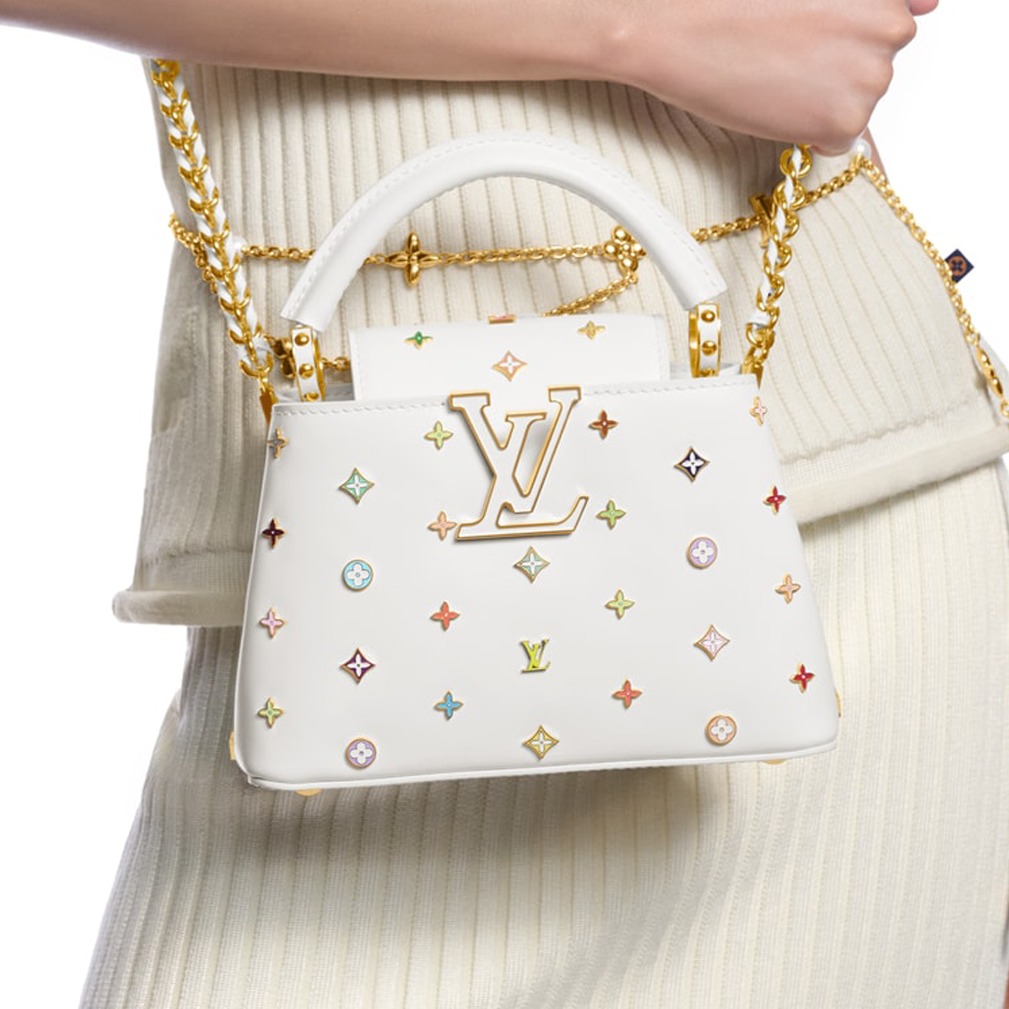 日本人アーティスト 村上隆ならではの陽気なレインボーカラーが、シックな雰囲気をフレッシュなシグネチャー仕上げで引き立てる「LV × TM カプシーヌ MINI」。メタルスタッズでマルチカラーのモノグラム・モチーフがあしらわれたトリヨンレザーを使用し、遊び心溢れるサイズに仕上げました。淡いピンクのカウハイドレザーのライニングが、内装にさりげないコントラストを描きます。さまざまな持ち方を楽しめる、取外し可能な編み上げストラップ付き。スマートフォンや小ぶりの財布など普段の必需品を整理できるコンパートメントを備えた内装も魅力です。