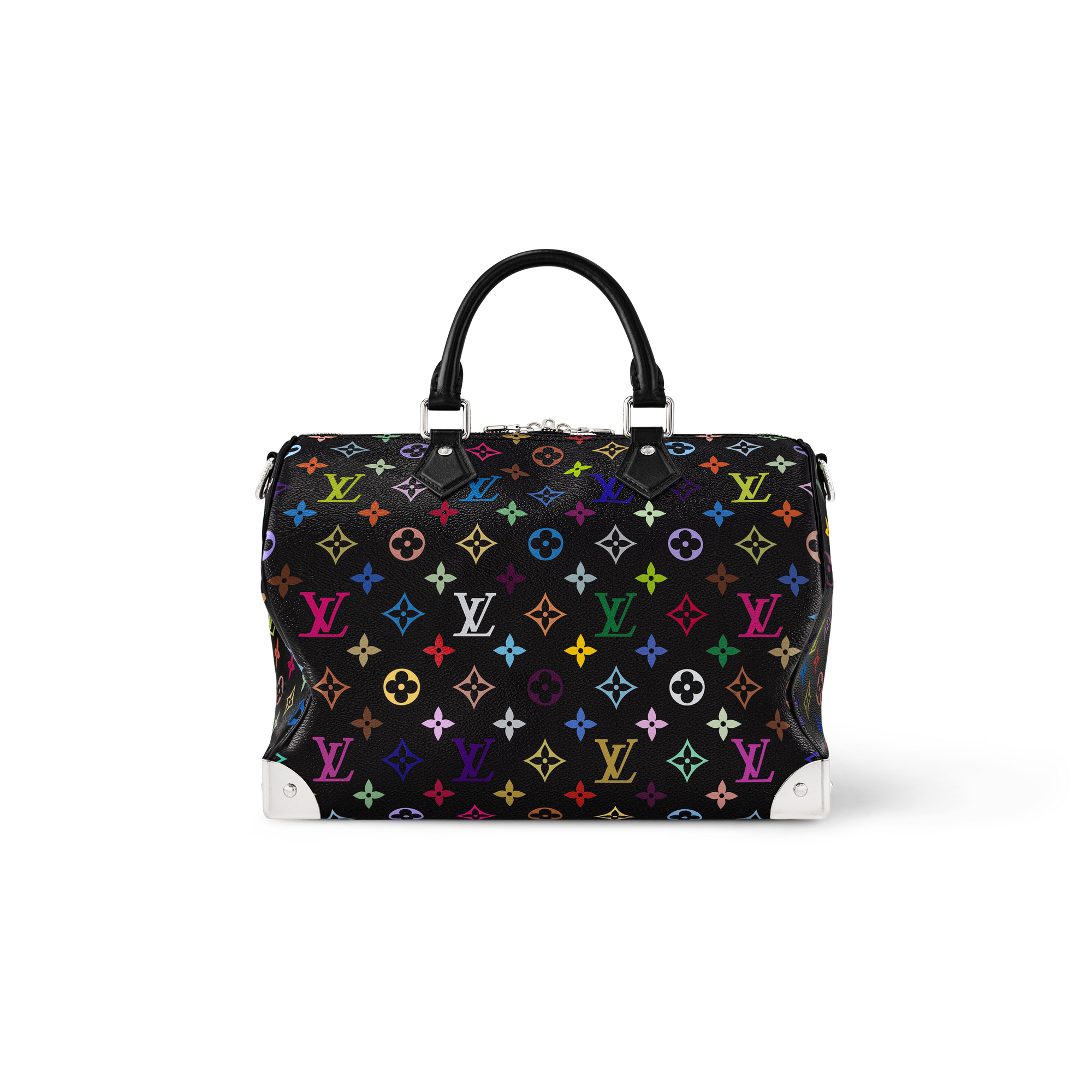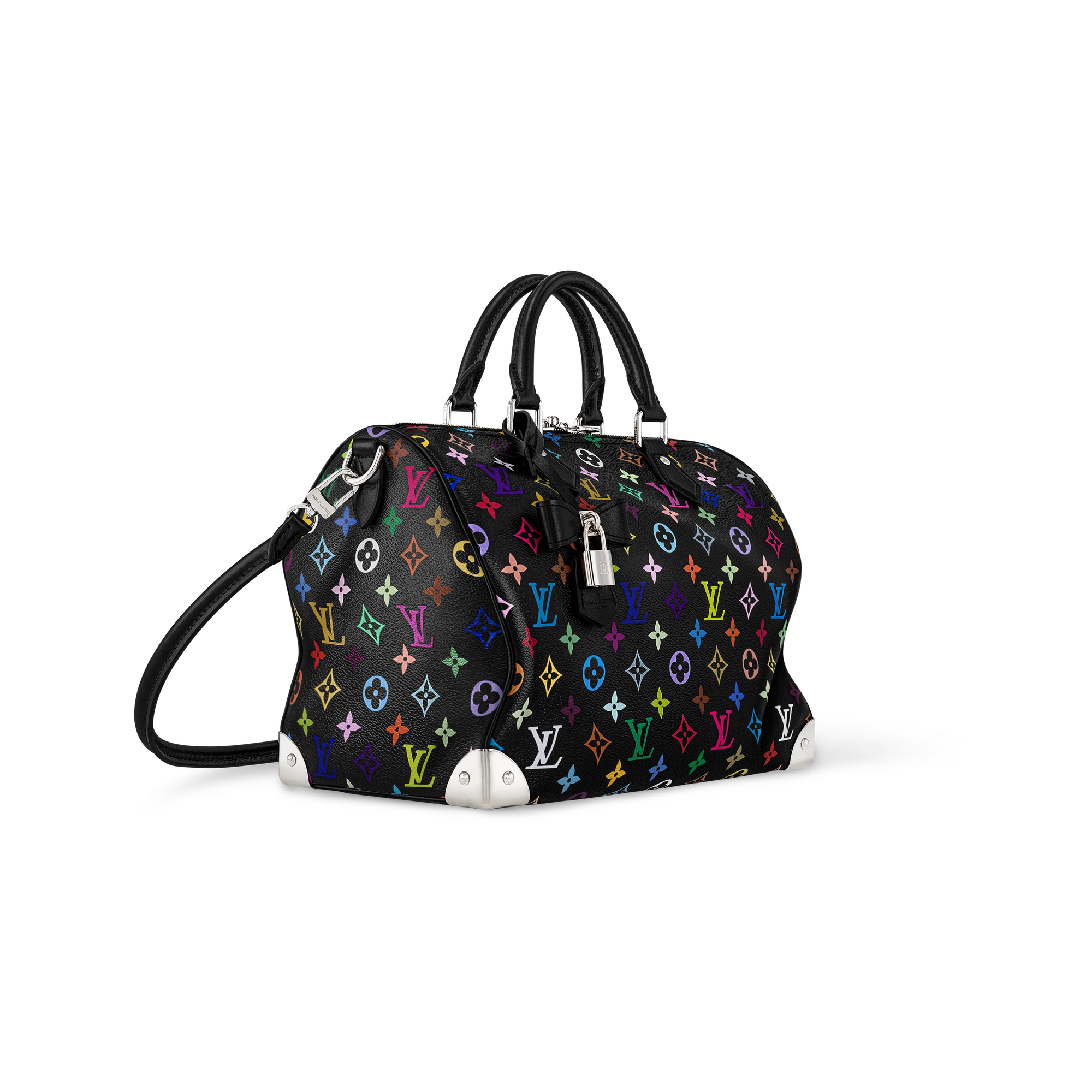 「ルイ・ヴィトン × 村上隆」コレクションのリエディションとして登場した、鮮やかなレインボーカラーのモノグラム・プリントを全面に施したしなやかなコーティング・キャンバスがインパクトを放つ「LV × TM スピーディ・バンドリエール 30」。トーン・オン・トーンのカーフレザーで仕上げた2本のトロンハンドルと同系色の取外し可能なショルダーストラップ付き。メゾンの伝統的なトランクを想わせるメタリックなコーナー部分とプレイフルなパドロック(錠前)を添えたリボン型のキーベルがシグネチャータッチを加えます。