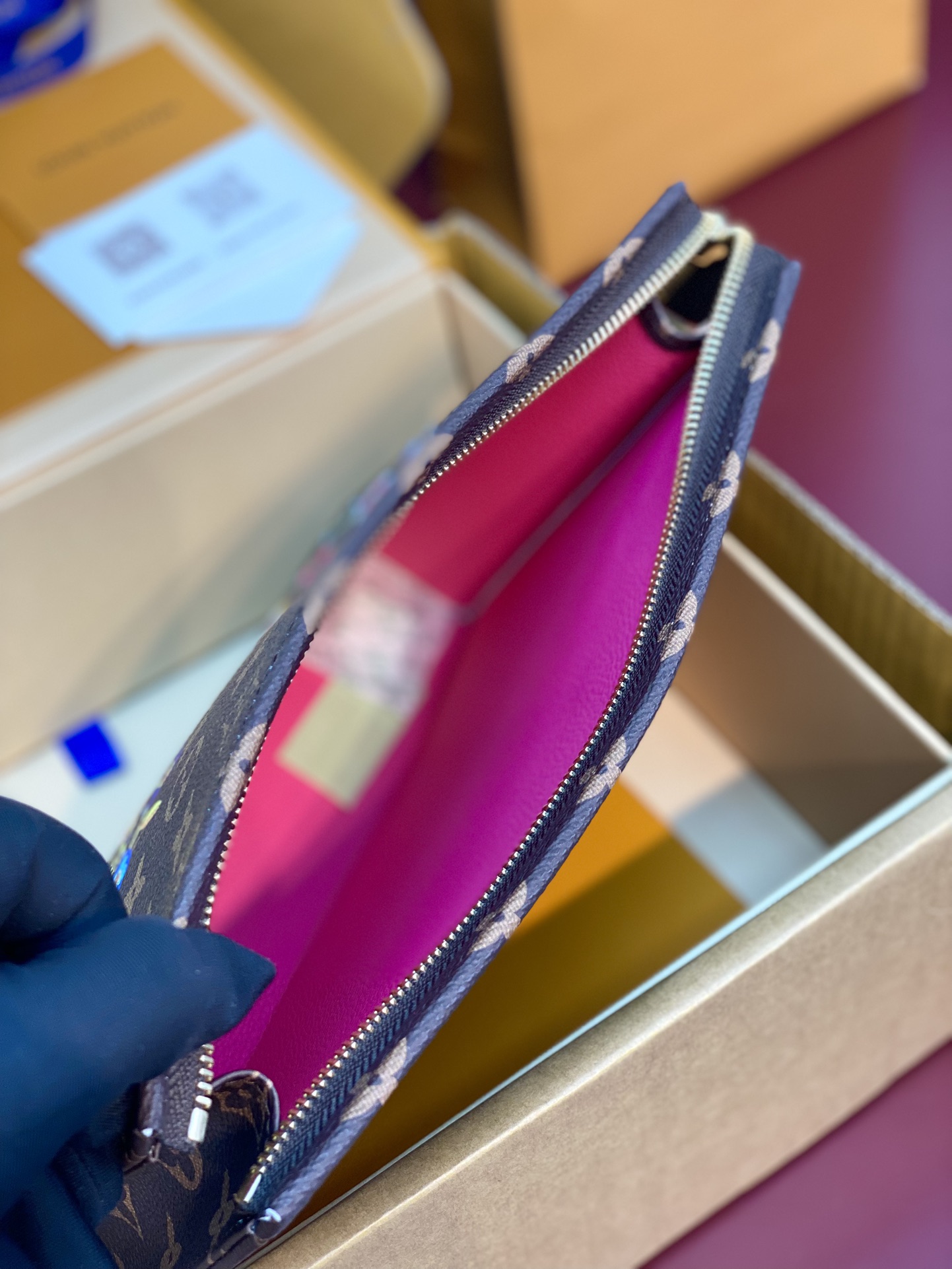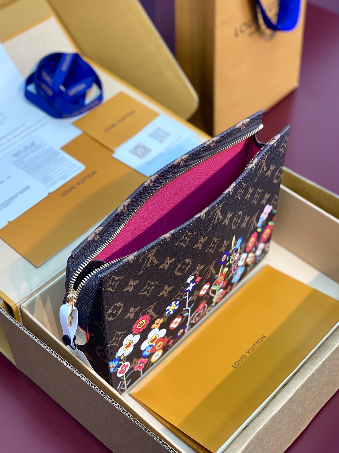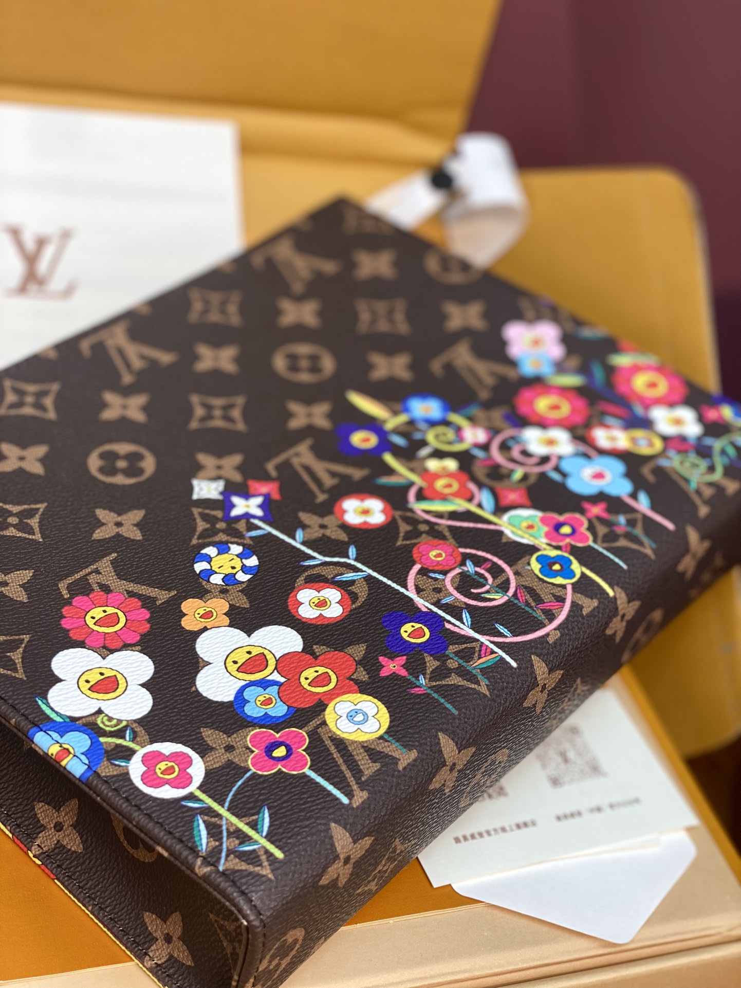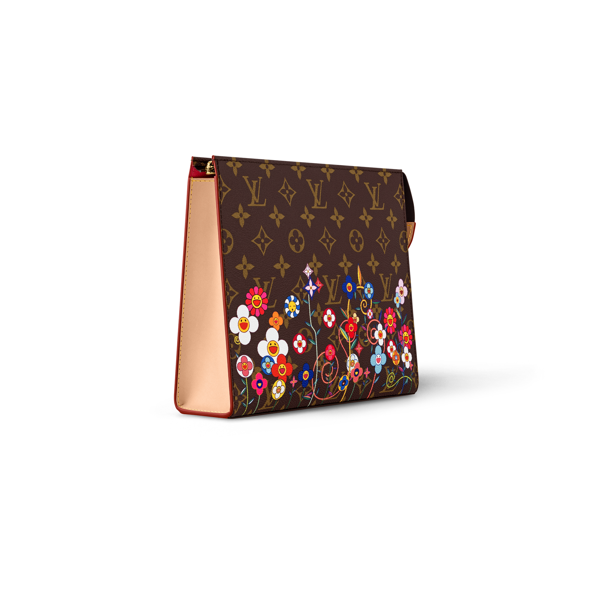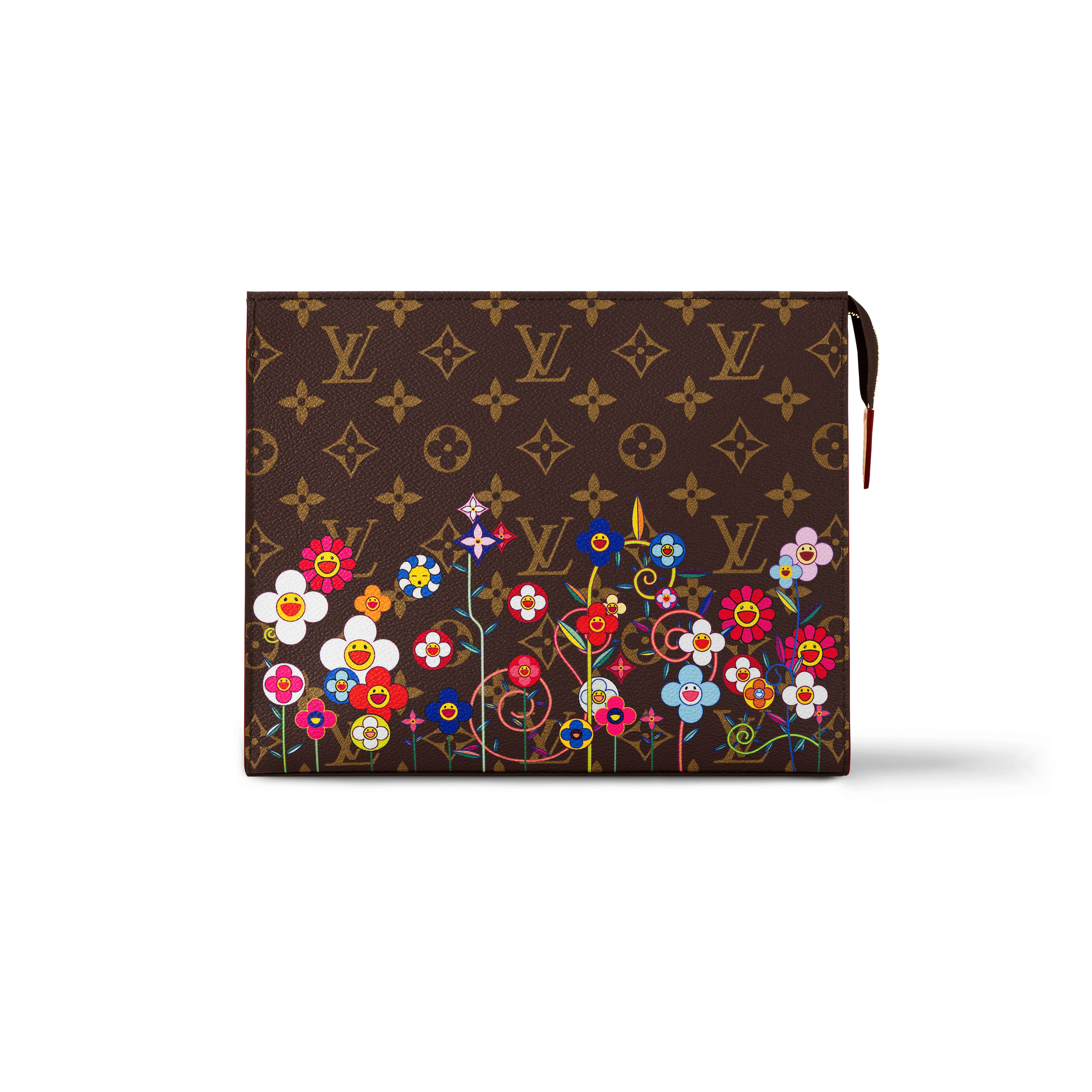 クラシカルなモノグラム・キャンバスで仕上げた定番の「LV × TM ポッシュ・トワレ NM」。多彩なカテゴリーで展開する「ルイ・ヴィトン × 村上隆」コレクションにふさわしく、この日本人アーティストを象徴する「スーパーフラット」なスタイルで再構築したモノグラム・フラワーを鮮やかなプリントであしらい、陽気な雰囲気にアップデートしました。中身を安全に持ち運べるゴールドカラーのファスナー開閉式。内側には必需品を整理できる2つのフラットポケットを備えています。実用的な水拭きできるライニングも魅力。