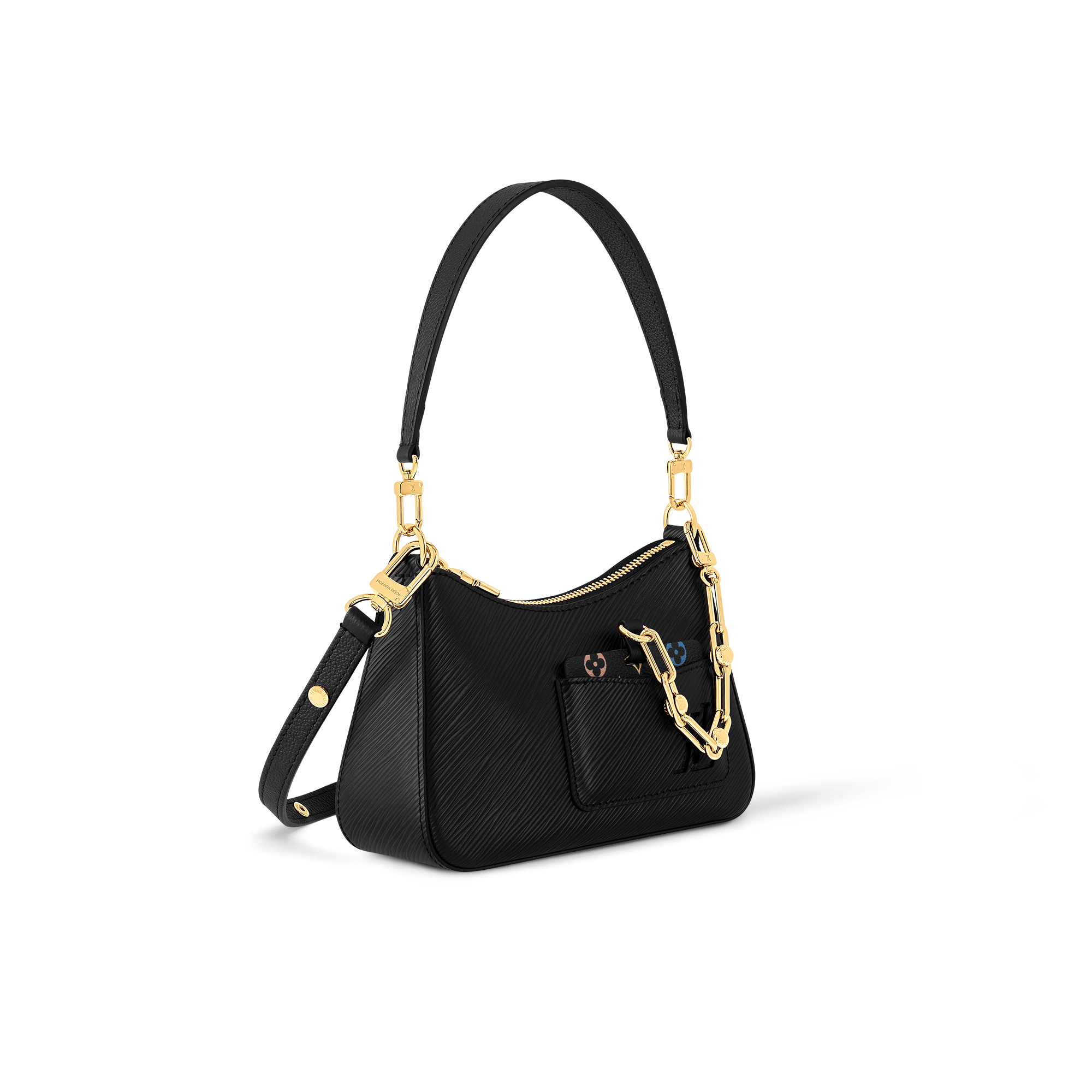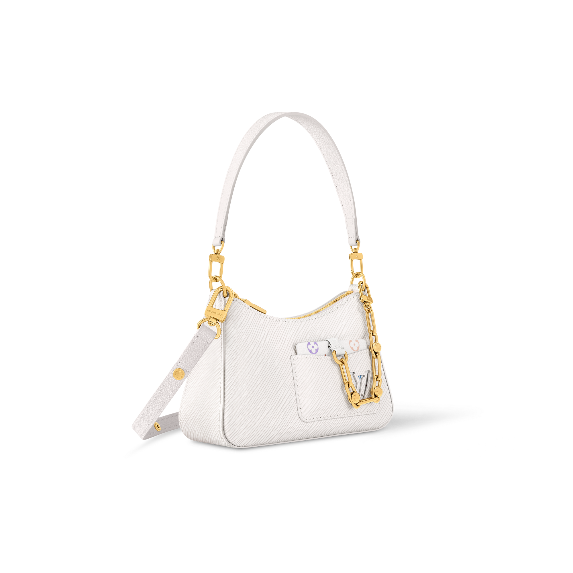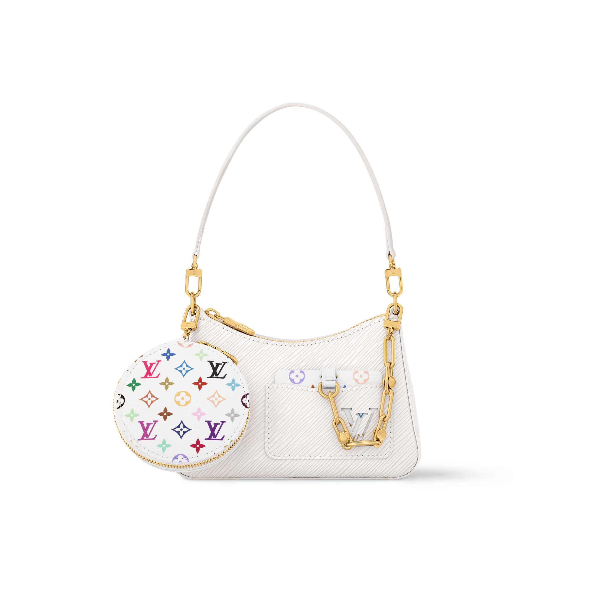 エレガントなエッジを効かせた「LV × TM マレリーニ」。メゾンの質感豊かなエピ・レザーを使用し、コンパクトでありながらも大ぶりのスマートフォンを含む普段の必需品を収納できるサイズに仕上げました。ワイルドな雰囲気のチャンキーなゴールドカラーのチェーンに配した「ルイ・ヴィトン × 村上隆」コレクションのモノグラム・マルチカラー キャンバスを用いたラウンド型のコインパースと外付けのミラーが、遊び心溢れるコントラストを描きます。