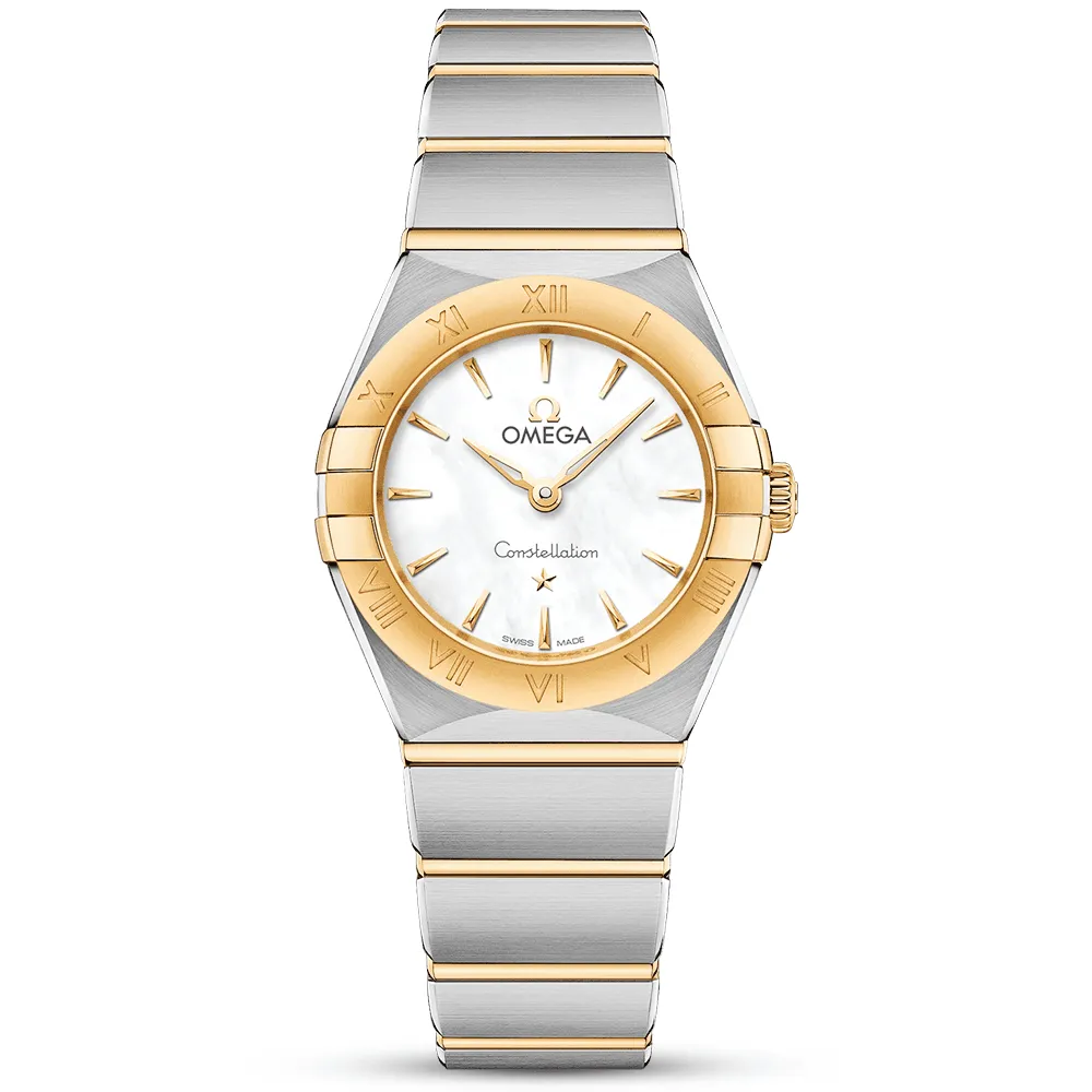 The timeless Omega Constellation watch is a highly sought-after collectable due to its enduring style and dramatic. instantly recognisable bezel design. This model. tailored for the slender female’s wrist. is forged from a mix of stainless steel and 18ct yellow gold. The luxurious timepiece measures 25mm in diameter and has been equipped with 30-meter water resistance for protecting a reliable Swiss-made quartz movement at its centre. The lady’s Omega watch presents the time on a mother of pearl dial adorned with stick indexes and hands crafted from matching 18ct yellow gold. The brushed 18ct yellow gold bezel with polished claws or “Griffes” is engraved with traditional Roman numerals and the top of the watch is sealed with a pane of sapphire crystal glass integrated with anti reflective properties. The lady’s Omega Constellation Quartz watch Features a closed caseback engraved with the Constellation Observatory medallion and comes complete on a stainless steel and 18ct yellow gold bi-colour bracelet. securing with an Omega-engraved folding clasp.
