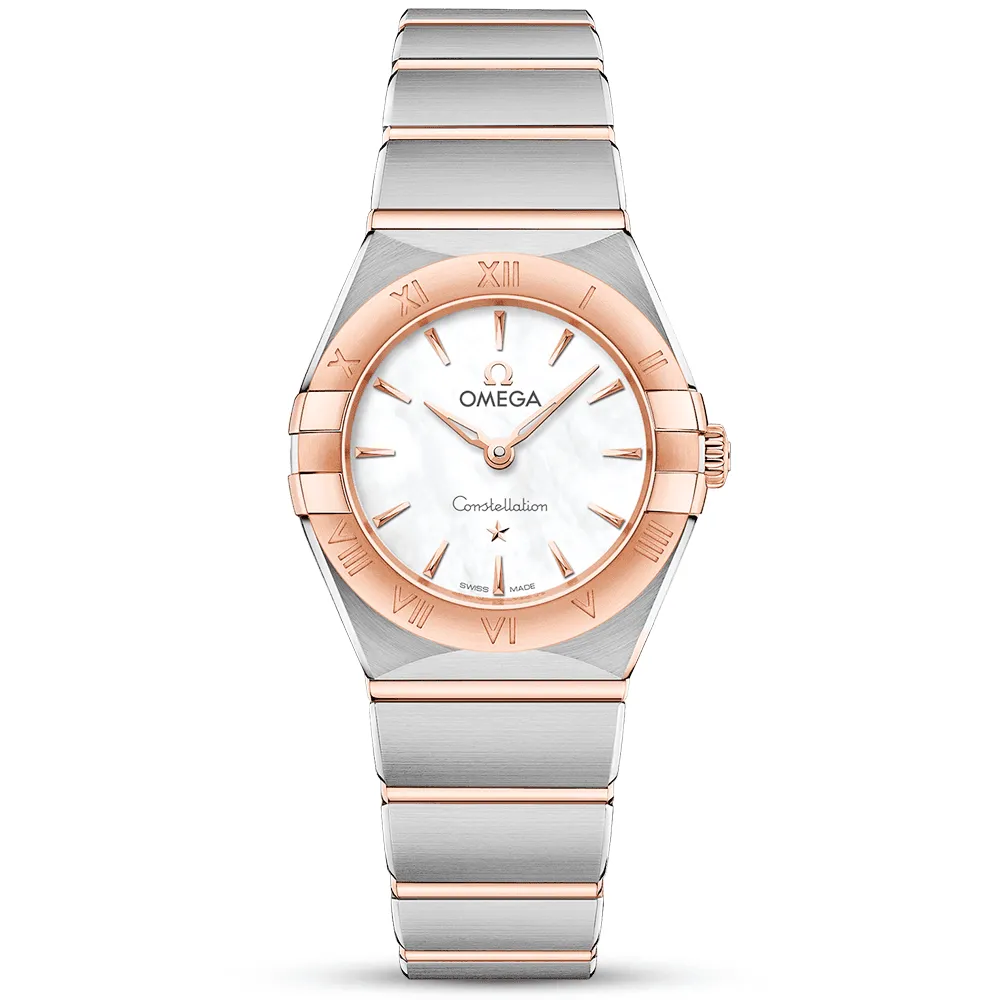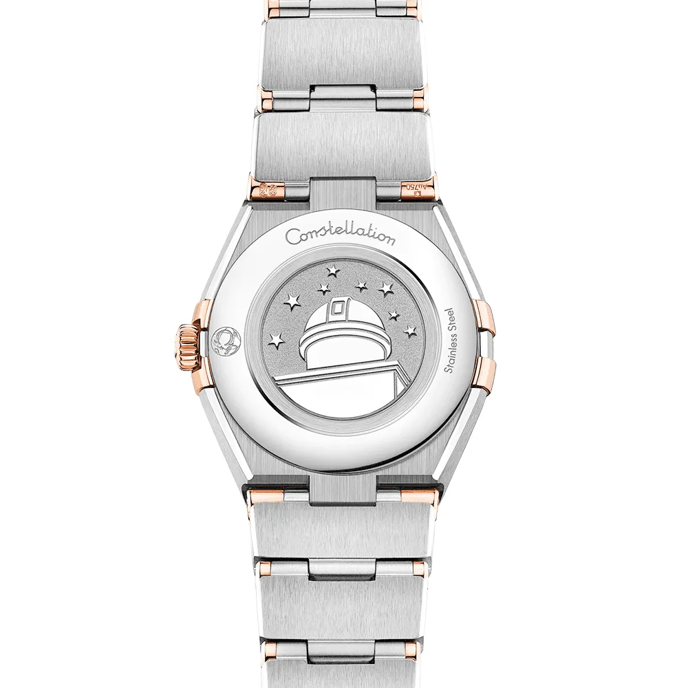Clothed in lustrous stainless steel and indulgent rose gold tones. Omega makes use of its proprietary alloy – 18ct Sedna Gold in the design of this model. The material is named after Sedna. an orbiting planetoid that is considered to be one of the solar system’s reddest in colour. This lady’s Omega Constellation Quartz watch is equipped with 30-meter water resistance and measures a 25mm diameter. The top of the case is sealed with a lens crafted from anti reflective sapphire crystal glass. while the back is engraved with the Constellation Observatory medallion. concealing a reliable Swiss-made quartz movement behind it. The dial of the lady’s Omega Constellation watch is presented in white mother of pearl and adorned with stick markers. hands and the Omega star forged from matching 18ct Sedna Gold. The model wraps effortlessly around the lady’s wrist with a bicolour metal bracelet crafted from stainless steel and 18ct Sedna Gold. securing with a folding clasp engraved with the famous Omega signature.