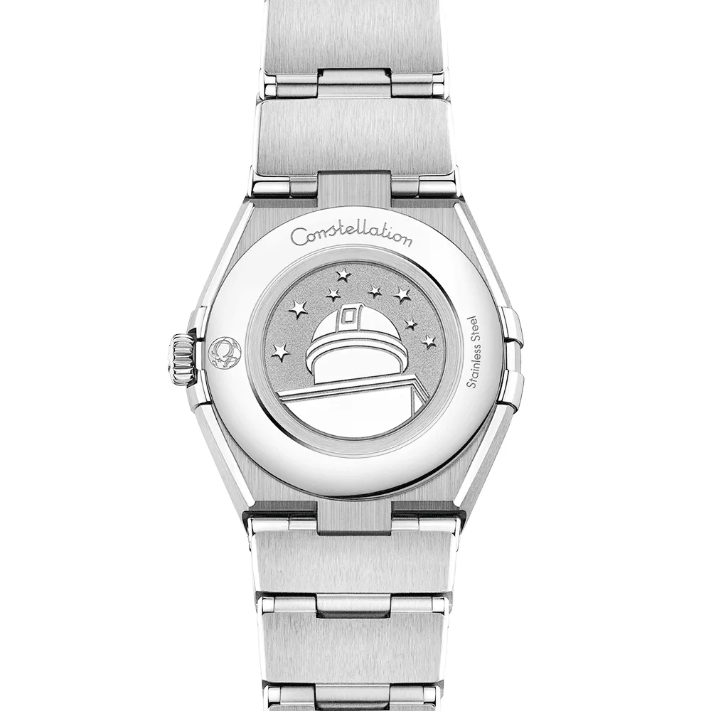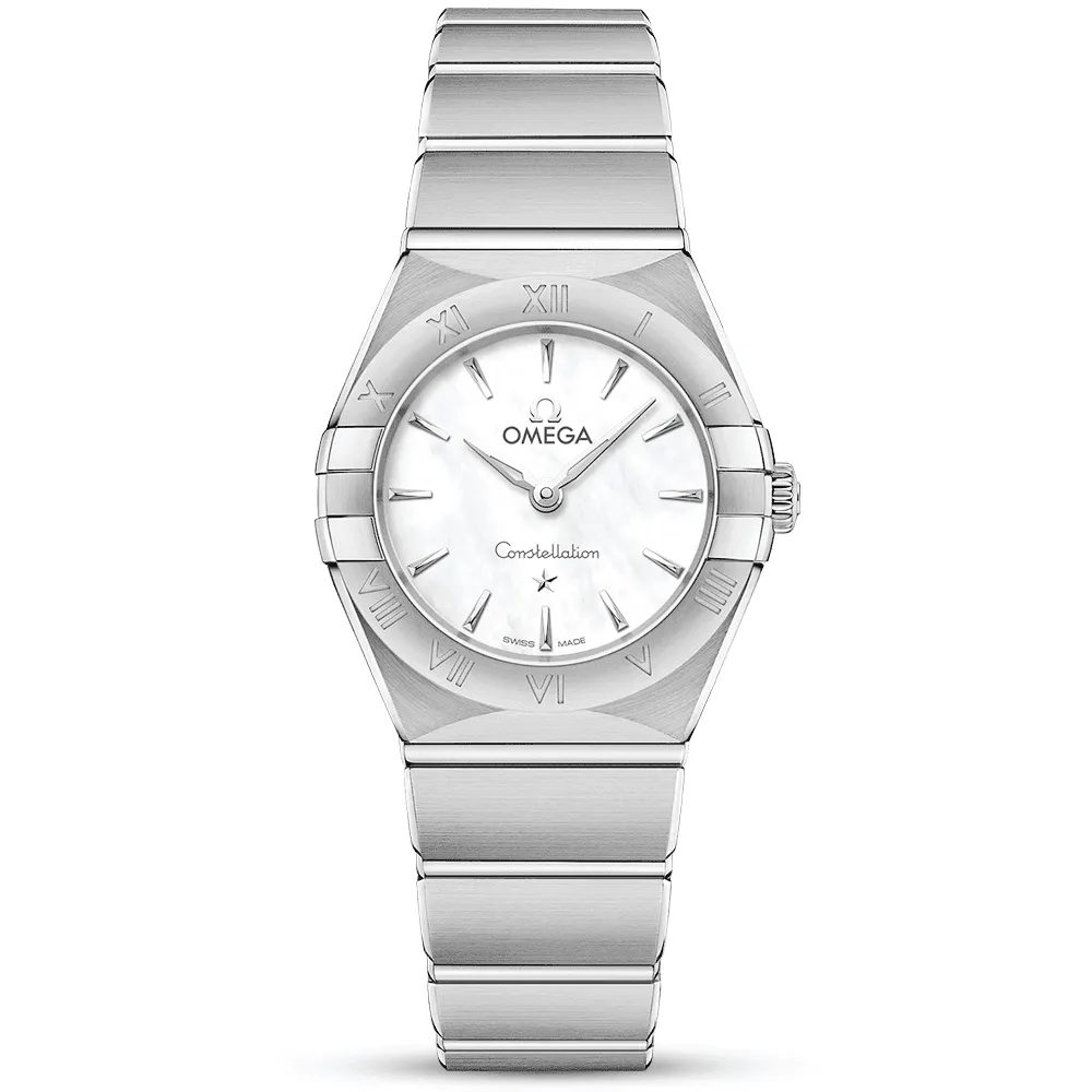 This classic Omega constellation watch for ladies is crafted from robust corrosion-resistant stainless steel and Features the instantly recognisable “Griffes” or claws synonymous with the collection’s enduring style. This model measures a 25mm diameter and has been integrated with 30-meter water resistance. Its sapphire crystal glass top protects a white mother of pearl dial from scratching. denting. heat. moisture and light damage. The stick indexes positioned around the hour track with meticulous attention to detail are polished to match the Constellation star motif. the brand logo and the slender. dauphine-shaped hands. The watch secures to the wrist with a matching stainless steel link bracelet and a foldable clasp engraved with the Omega signature. Powered by a reliable quartz movement concealed behind a specially engraved caseback. the Omega Constellation Quartz watch is a companion for life. constituting the perfect timekeeping tool for work. leisure and travel.