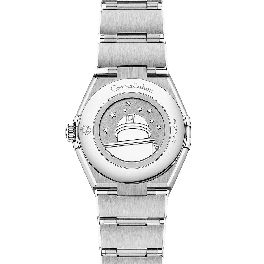 Beautifully presented in gleaming tones of crisp stainless steel and presenting the time on a sumptuous mother of pearl dial. this elegant lady’s Omega watch from the Swiss brand’s Constellation collection balances form with function whilst imparting a luxurious style on the wrist. Its distinct chiselled bezel adorned with the famous claws is a characteristic of the popular Omega Constellation collection. as is the mono-rang bracelet that comfortably secures to the wrist with a foldable clasp adorned with the Omega logo. This compact 28mm Omega Constellation watch is 30-meter water resistant and Features engraved Roman numerals upon its stainless steel bezel. The watch. topped with anti reflective and scratch resistant sapphire crystal glass protects a set of meticulously placed round brilliant-cut diamonds that catch the light playfully. Behind this captivating dial adorned with the famous Constellation star is a Swiss-made quartz movement that guarantees accurate timekeeping. It sits behind a sealed caseback stamped with the Constellation Observatory medallion.
