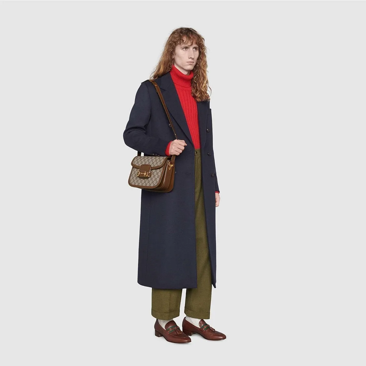アーカイブデザインを再解釈した〔グッチ ホースビット 1955〕バッグが最新コレクションに登場。60年以上前の誕生時と同じラインやフォルムを取り入れながら、オリジナルのディテールに現代的なスピリットを加え、ホースビットを際立たせています。ダブルリングとバーで構成されたこのモチーフはブランドのルーツを物語るもので、乗馬の世界から取り入れたグッチのシンボルの中でも最も代表的なエレメントのひとつとなっています。このショルダーバッグでは小さなフラップにホースビットをあしらい、グッチのもうひとつのコードであるGGパターン入りファブリックと印象的に組み合わせました。ショルダーストラップは長さを調節できるため、ショルダーバッグとクロスボディバッグのツーウェイでお使いいただけます。