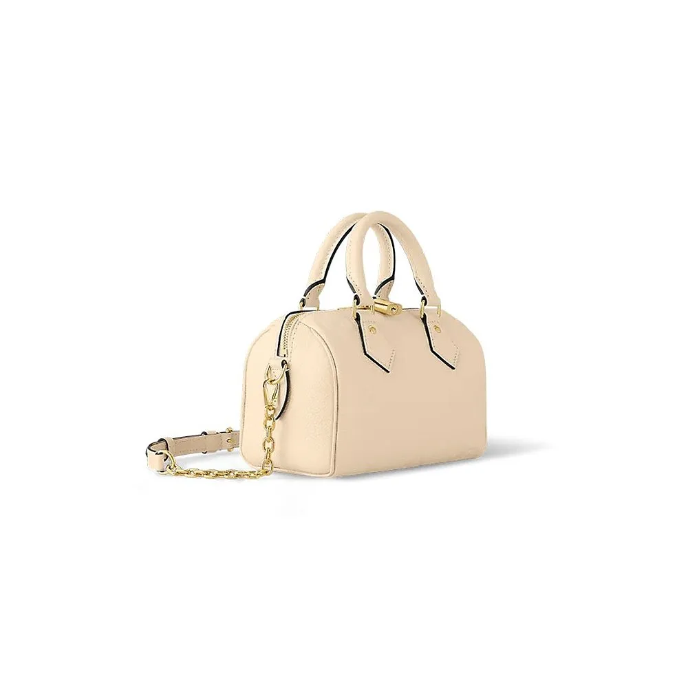 メゾンならではのクラシカルなシルエットに仕立てたスピーディバンドリエール 20。クリーム色のモノグラムアンプラント レザーに同系色のマイクロファイバーでライニングを施し、タイムレスでエレガントな雰囲気にアップデートしました。20世紀初頭から活躍を続けるルイヴィトンの旅行鞄を彷彿させる、ユニークなラインと2本のトップハンドルも魅力。取外し可能なチェーンとレザーのストラップで、ショルダーキャリーやクロスボディキャリーもお楽しみいただけます。
