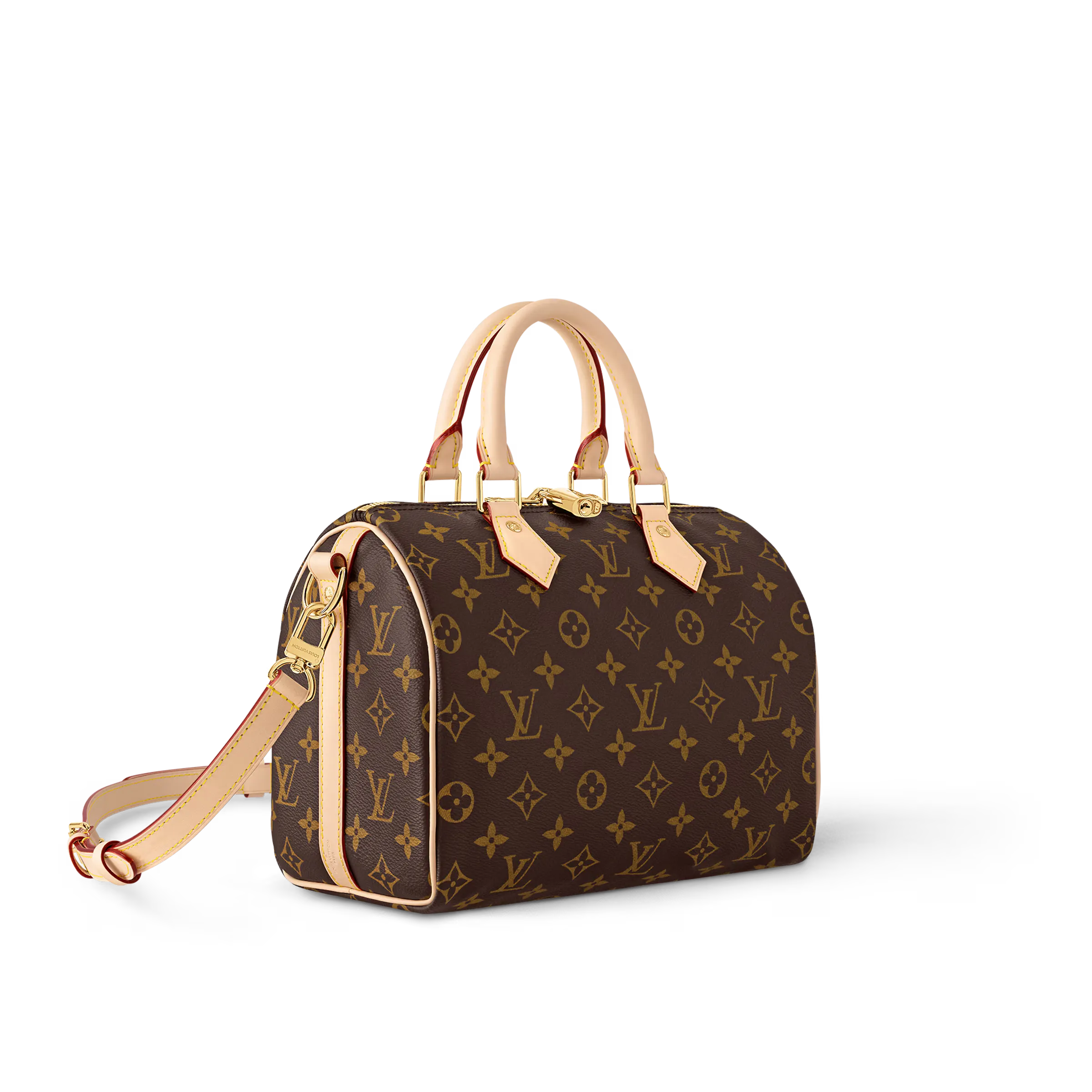 ルイヴィトンならではのモノグラムキャンバスで仕上げたスピーディバンドリエール 25。日常生活にぴったりのシティバッグです。スピーディの前身であるバッグエクスプレスは、1930年代の旅人のために作られたもの。その名は加速化が著しかった当時の移動手段にヒントを得ています。一目でそれと分かる独特のシルエット、ロール仕上げのレザーハンドル、刻印を施したパドロック(錠前)、取外し可能なストラップなど、すべてのディテールがスピーディを特別な存在にしています。本製品は折り畳んだ状態でお届けいたします。これは、メゾンを象徴する折り畳んでトランクに収納できるソフトラゲージの伝統に由来するものです。予めご了承ください。
