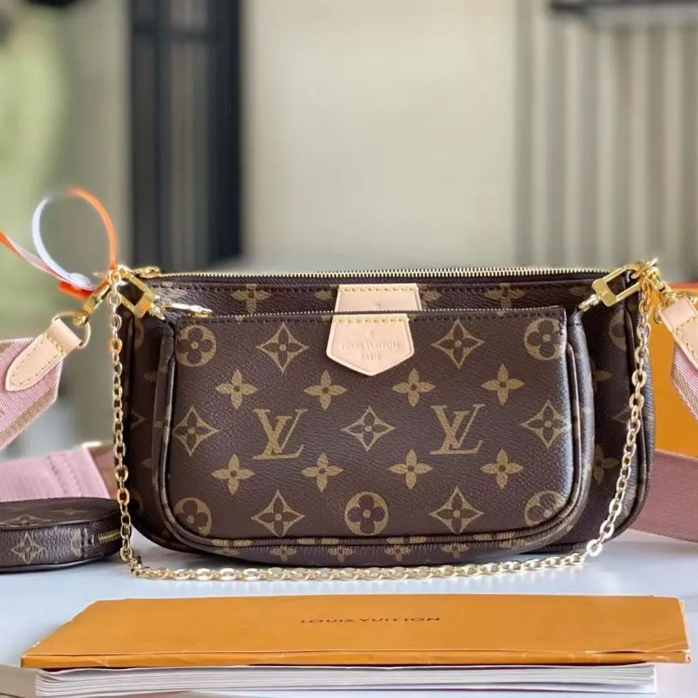 複数のポケットとコンパートメントを備え、クロスボディバッグとして多用途にお使いいただける「ミュルティポシェットアクセソワール」。「ポシェットアクセソワール」、「ミニポシェットアクセソワール」、「ポルトモネロン」を組み合わせたアイテムです。ポシェットには取外し可能なゴールドカラーのチェーンと「Louis Vuitton」の文字を織り込んだジャカード生地の調節可能なストラップが付属し、さまざまな持ち方をお楽しみいただけます。
