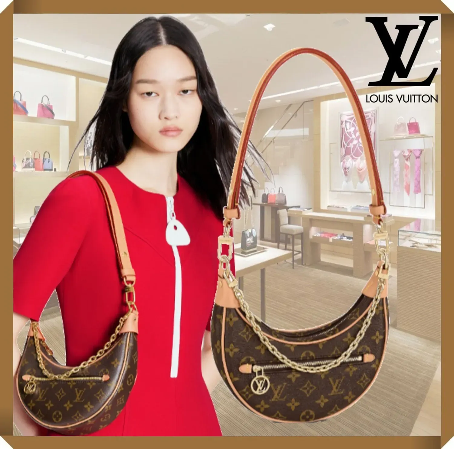 ニコラジェスキエールが2022クルーズコレクションに相応しくデザインした「ループ」。メゾンのアーカイヴに残るバッグ「クロワッサン」から着想を得た半月型のバゲットバッグです。ボディフレンドリーなコンパクトなデザインに、ショルダーキャリー可能なチェーンと、クロスボディバッグとしても使用できるレザーストラップが付属しています。フロントのファスナー付きポケットには、LV サークルの引き手をあしらいました。