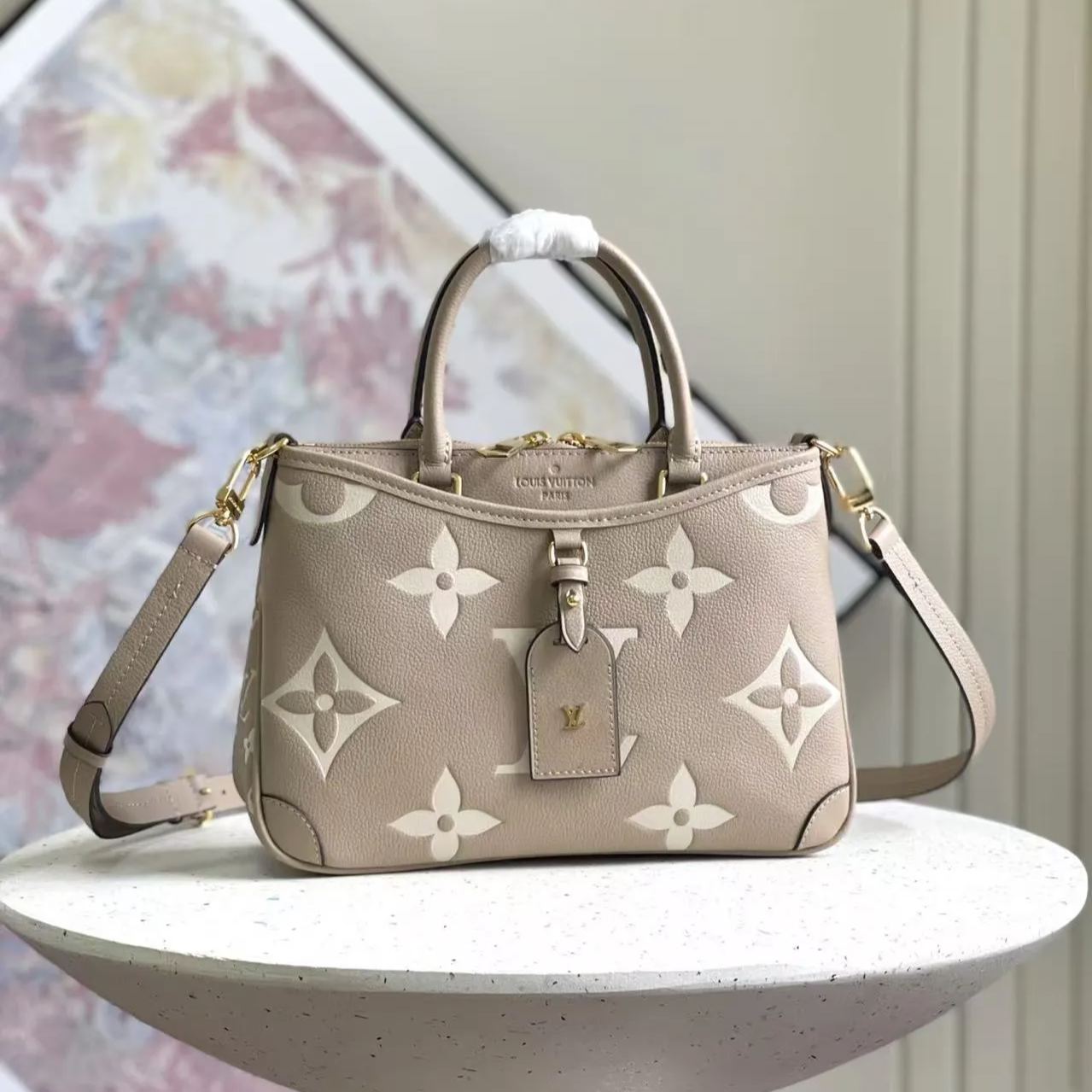 Vシェイプのカットのシルエットが特徴的なトリアノン PM。柔らかなクリームカラーのレザーにモノグラムフラワー モチーフとLV シグネチャーをエンボス加工で施した、グレインが美しいモノグラムアンプラント レザーで仕立てました。2本のトップハンドルと取外し & 調節可能なストラップで、さまざまな持ち方をお楽しみいただけます。
